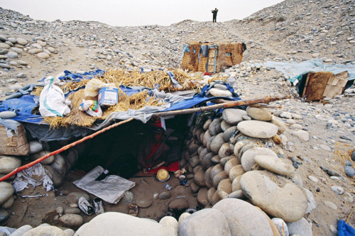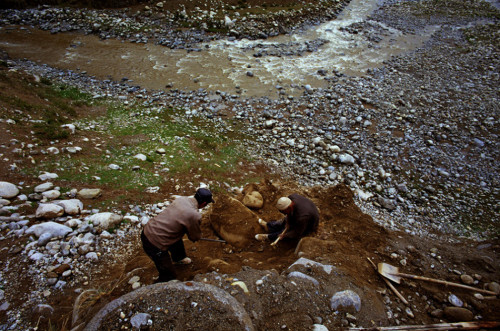 2007年以前,玉龙喀什河源头的黑山村还很封闭,没有多少人知道挖玉能够改善生活,而如今,奔往这里的人如同像是赶集。2007年,去往昆仑山深处阿勒玛斯玉矿的路上,挖玉人停下脚步向真主祈祷一路平安的同时,也祈求此行有所收获。2011年1月,几台挖掘机在玉龙喀什河床上作业。从2006年起,挖掘机进驻玉龙喀什河进行玉石挖掘,2010年最多时,这条河两岸的挖掘机数量超过2万台。一台挖掘机,正常工作一天需要要3000多人民币的油,这些都是挖玉的成本。2010年,一位玉石商人,一个人就拥有38台挖掘机。