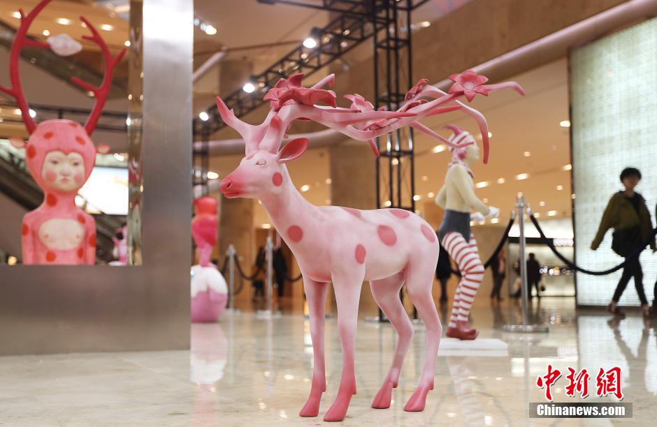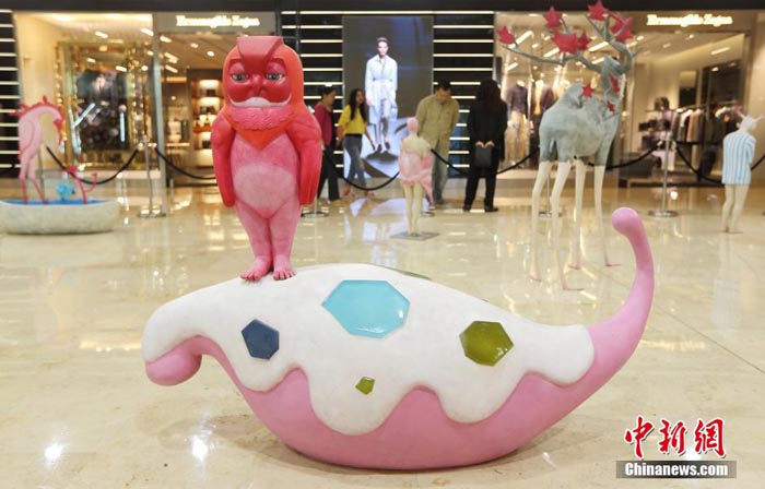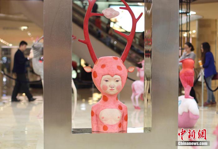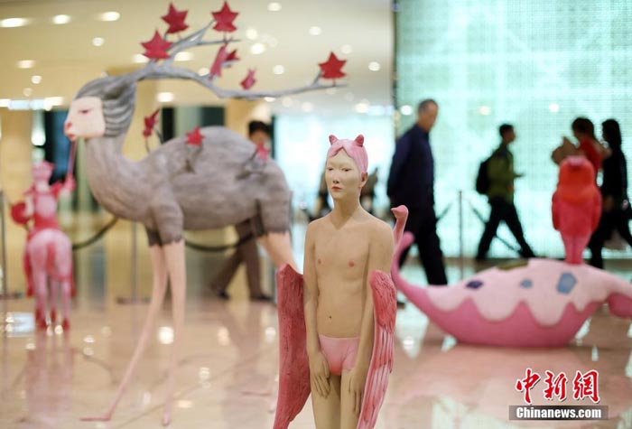 4月2日,市民被展出的雕塑作品吸引。当日,“盎然艺境”秦玮鸿雕塑艺术展在南京德基广场举行,展出的作品色彩炫目、造型新奇,充满了无尽的想象力。勇敢的骑士、拟人化的猫头鹰、充满神奇色彩的麋鹿……“童话”般的场景将梦境中的幻想搬进了现实,令观众仿佛置身于童幻与艺术的轻松游戏中,感受趣味时刻。中新社发 泱波 摄