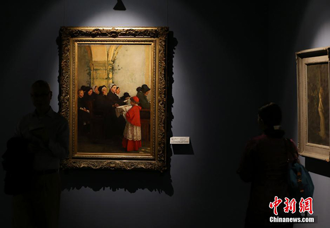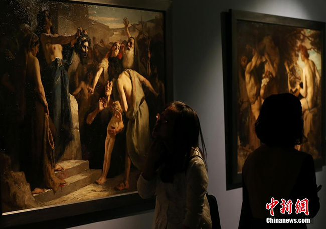 5月8日,由中华世纪坛世界艺术馆与法国八家博物馆共同主办的“大师与大师——徐悲鸿与法国学院大家作品联展”在中华世纪坛世界艺术馆开幕,展览将持续到8月3日。展览将展出绘画作品共123件,其中包括徐悲鸿先生留学法国期间四位法国导师的重要代表作品,并首度将徐悲鸿先生及法国学院大家们的绘画作品同期展出。作为学院派的重要代表,法国新古典主义大师安格尔亦有作品在“大师与大师”中展出。图为观众观看徐悲鸿名作《田横五百士》。中新社发 杜洋 摄