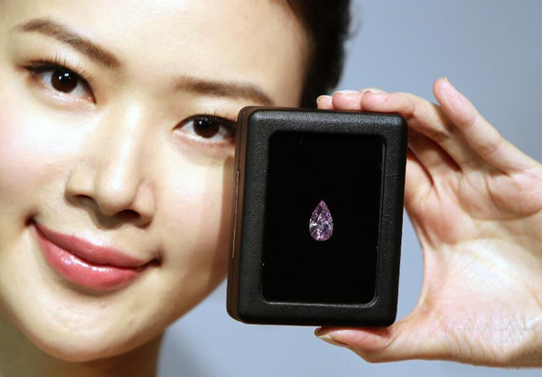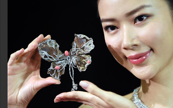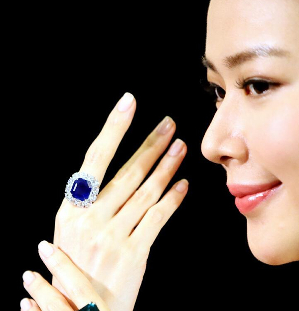 9月20日,模特在香港苏富比瑰丽珠宝及翡翠首饰2014年秋季拍卖会传媒预览上,展示17.16克拉方形天然克什米尔蓝宝石镶钻戒指(上)和35.72克拉方形天然哥伦比亚祖母绿镶钻戒指,估价分别为2200-2800万港元、3200-3600万港元。