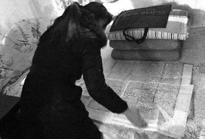 昭陵博物馆内一经营工艺品的女子在商店隔间的小屋内,悄悄向游客展示尉迟敬德和程咬金的墓志志石拓片 佘樱 摄